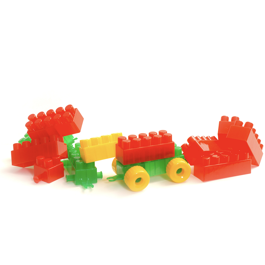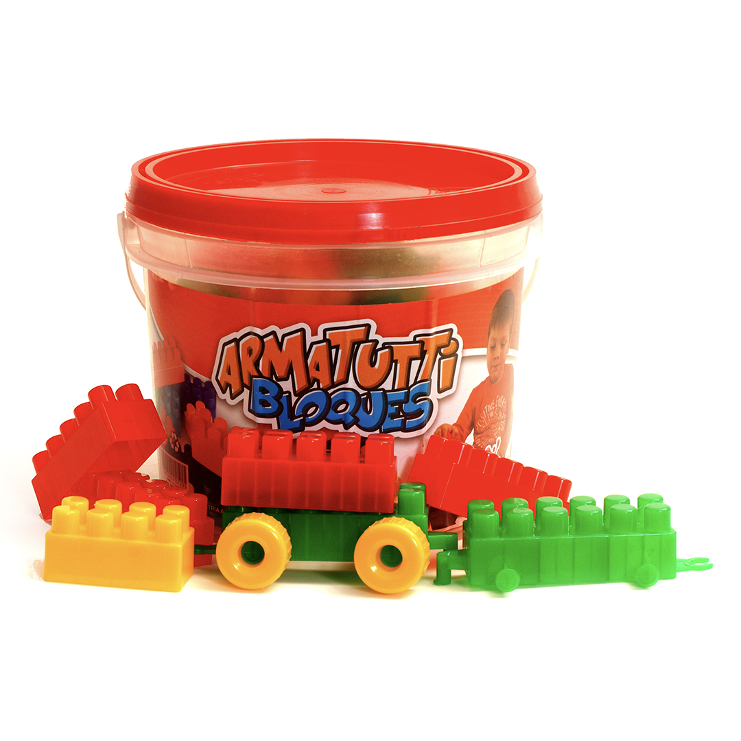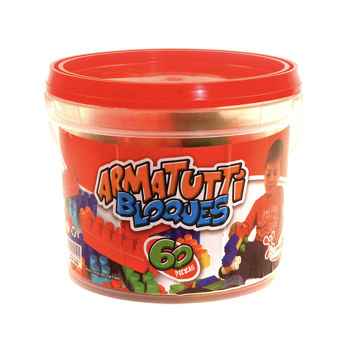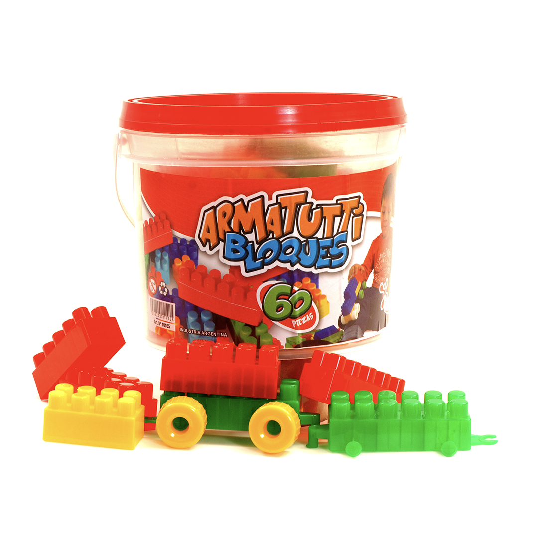 Balde con 60 ladrillos de encastre, perfecto para almacenar y construir en cualquier lugar.
